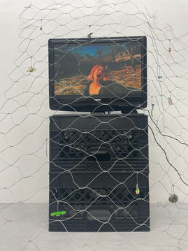 2024. Single-channel digital video, plastic crates, metal wire, acrylic paint, glass bead, hand-carved avocado seed, perfume bottle, metal screw, metal spring, wooden stick, hair clip, air-dry clay, found objects.